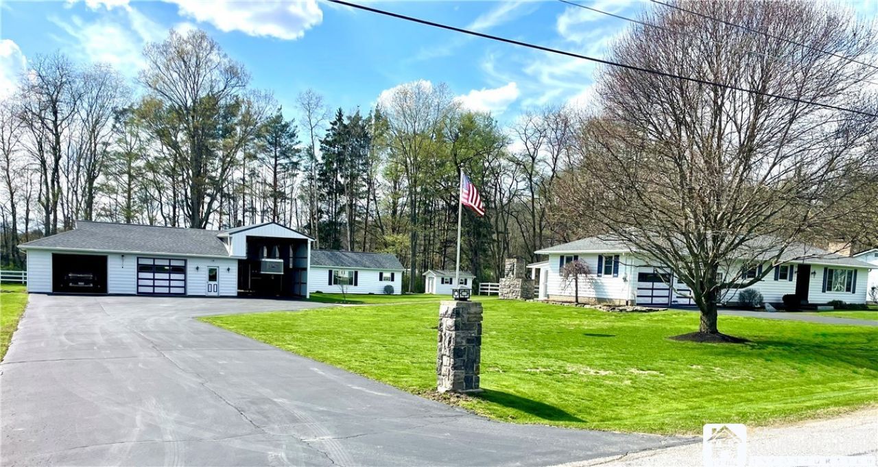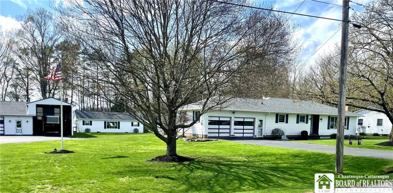 Opportunities like this do NOT come around often! This one-of-a-kind 1.35-acre property in the highly sought-after Portville School District features not one, but TWO ranch homes, a massive 6-car garage, and two additional sheds - offering endless possibilities for multi-generational living, rental income, home-based business space, or the ultimate hobbyist setup. The main ranch delivers 3 bedrooms and 1.5 baths on the primary level, complemented by a fully finished basement complete with a full bath featuring a Jacuzzi tub, a dedicated bar room perfect for entertaining, and two additional bonus rooms ideal for a bedroom, gym, office, or craft space. The attached 2-car garage is a standout in itself - heated, epoxy flooring, floor drainage in both bays, space for a workbench and storage, plus natural gas, electric hot & cold water, and cable. Behind the home, a beautiful stamped concrete sunroom opens to the backyard where you'll find an outdoor fireplace and seamless access to the impressive 1,760 sq ft 6-car garage. This structure includes a 14' x 15' x 45' camper build-out complete with septic connection and dedicated fuse box - a rare and valuable feature. The second ranch, built for a family member in 2020, offers 960 square feet with 2 bedrooms, 1.5 baths, and a bright sunroom off the back and it comes fully furnished. Perfect for Airbnb potential, extended family living, or maintaining privacy while staying close. Meticulously maintained inside and out, this property includes updated windows and siding, all PEX plumbing, two septics with new lines (2019), leaf guard system, Wave dehumidifier, updated carpet and paint, a roof only 5 years old, bathroom under 2 years old with custom tiled shower, owned water softener, built-in wall safe, laundry chute, full attic spanning the home and garage, manicured lawn (husquavarna phone operated, robotic lawn mower included), and so much more too numerous to list. Solar fields behind the property provide approximately 30% savings on electric costs. Space. Infrastructure. Flexibility. Condition. This is not just a home it's a rare compound-style opportunity that must be seen in person to truly appreciate.