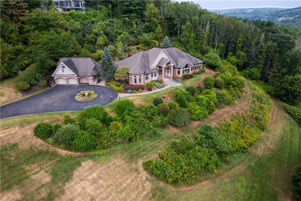 Absolutely spectacular custom built home with quality throughout. This 4 bedroom, executive ranch style home is situated on 6 acres offering amazing views of the area and is centrally located. Double door vaulted entryway, formal living room with double sided fireplace and doors leading to an outside patio, formal dining room can seat many, large great room with fireplace with expansive windows to capture the view; sunroom or reading room, fabulous eat-in kitchen with all top of the line appliances, breakfast bar, dining area and adjacent pantry has numerous storage cabinets and desk area plus there is an adjacent1/2 bath. The east wing has 3 very good size bedrooms and 2 full baths. The west wing has a private office den or nursery off the huge master bedroom suite which include a spacious bathroom with double vanity, shower, walk-in tub, private toilet and extra-large walk-in closet. There is a first floor laundry plus a lower level recreation room with full bath. The full, concrete basement is divided into sections which could be easily finished into several additional rooms. There are 2 hot water baseboard furnaces and 2 brand new central air units. The breezeway attaches the house to the 3 car garage. Above the garage is a 2 room apartment with a living room, bedroom and full bath. Everything you have been looking for is right here! It's gorgeous!